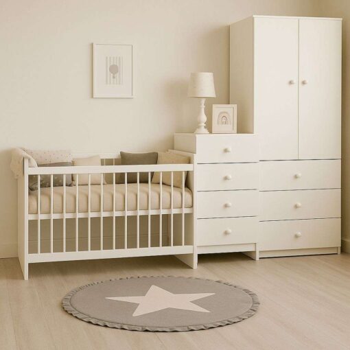 CUNA COLECHO LOLA CON COLCHON ACOLCHADO CHICHONERA BANDERINES ALMOHADON Y ROPERO (1.70 X 0.70) + CHIFFONIER 1 X 0.60