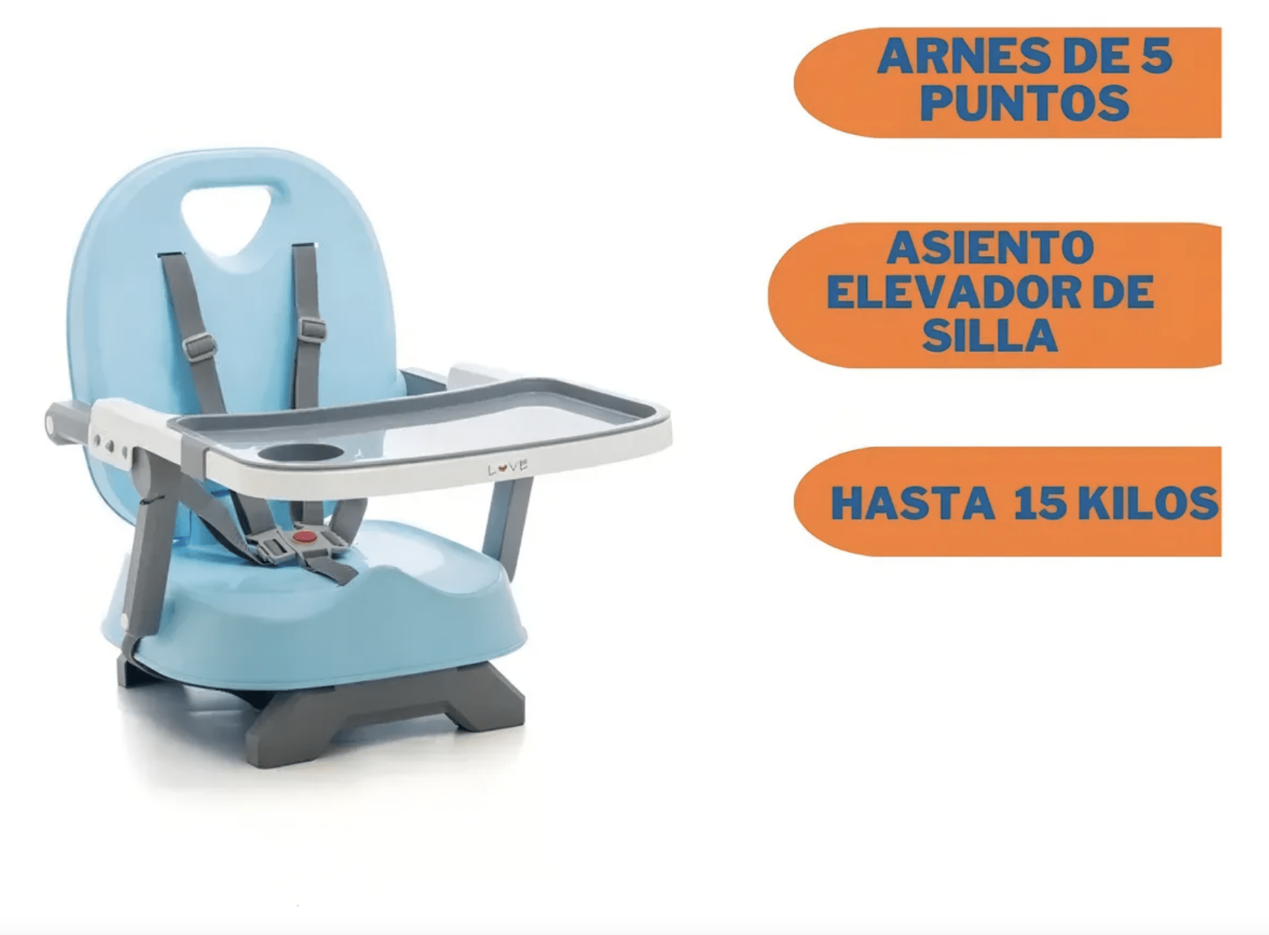 * Dos alturas como Booster: Bajo o Alto (con “patas” que sirven como elevador).